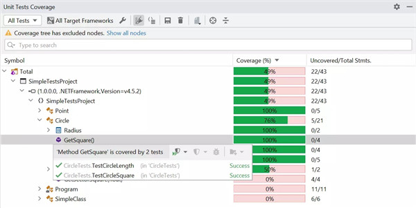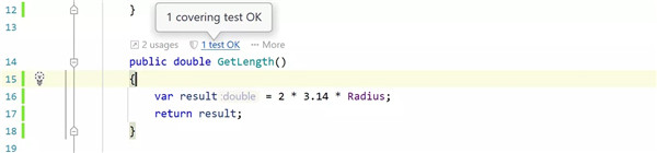 使用快捷方式检测哪些单元测试覆盖特定语句:弹出窗口Visual Studio将显示覆盖测试列表,并允许您导航到其中任何一个。