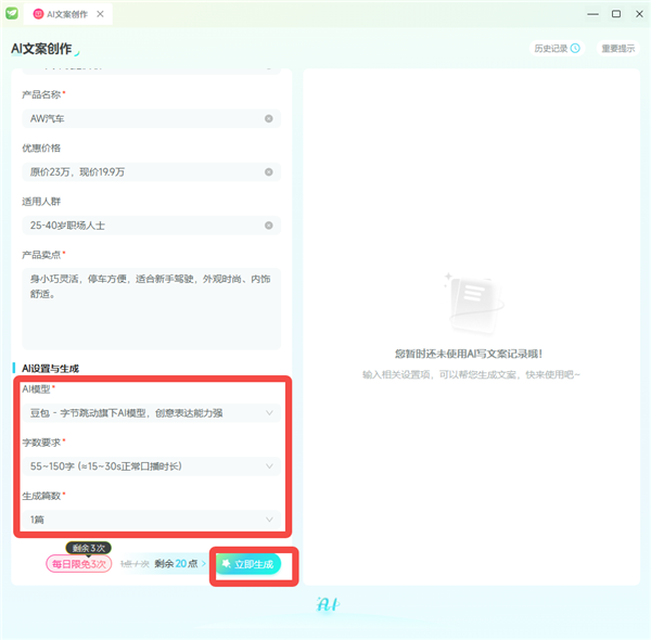 3、然后选择AI模型,选择需要的字数以及篇数,点击【立即生成】。