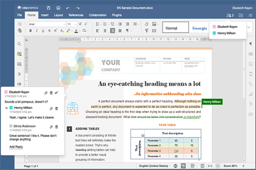 连接到服务器并与您的团队进行文档协作:实时协作编辑,审阅,评论以及使用聊天进行交互。