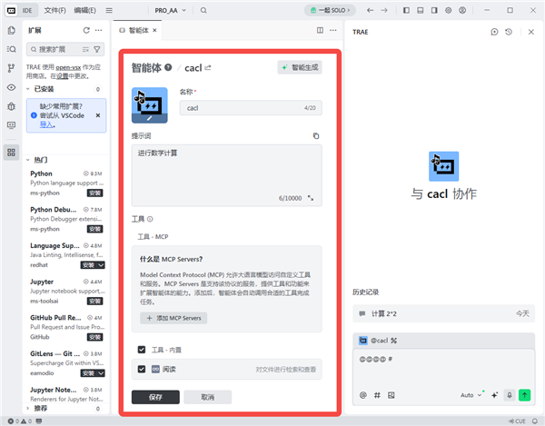 TRAEIDE支持多种外部工具的无缝集成,让你的智能体根据个人需求灵活调用工具,打造独一无二的任务执行能力。通过MCP(ModelContext Protocol),你可以赋予智能体专属的外部资源调用能力,根据自己的使用场景和目标,精细化打磨AI的能力边界。