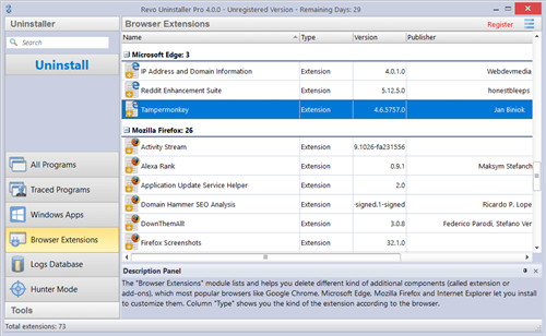 所有现代浏览器都支持所谓的附加组件或扩展,其目的主要是增强浏览器的功能,但是扩展越少,浏览器的速度就应该越高,许多程序通常可以在未经您许可甚至不知道的情况下安装自己的浏览器扩展,如果恶意软件意图故意,不断将您重定向到不需要的网站,并以各种其他方式干扰您的Internet浏览体验,这可能会非常令人不快且令人沮丧,自然地,可以删除这些扩展名,并且所有浏览器都提供删除扩展名的方法,但是必须在每个单独的浏览器中浏览各种窗口和菜单可能会很麻烦并且很耗时,相反,Revo Uninstaller Pro在单个窗口中按浏览器分组列出系统上的所有扩展,那当前,受支持的浏览器是:Google Chrome,Mozilla Firefox,Microsoft Internet Explorer,Microsoft Edge和Opera