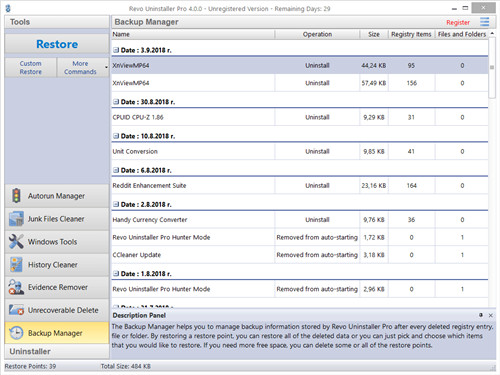 3、任何备份的注册表遗留内容(和文件,如果您更改了删除文件遗留的方式)将在备份管理器中列出,以便于访问和管理。