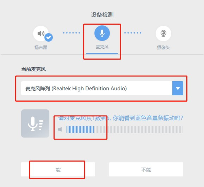 当您点击进入教室后,检测完扬声器,接下来是麦克风检测。需要您对着麦克风讲话观察音量条是否波动,如果不波动,则上课时对方可能听不见您的声音。此时请参考以下步骤解决~