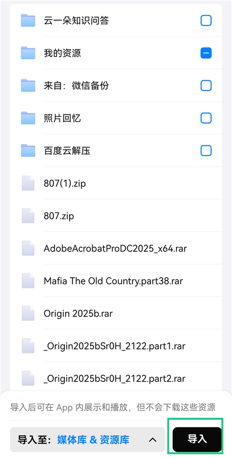 5、勾选需要导入的文件夹或者视频文件,点击【导入】。