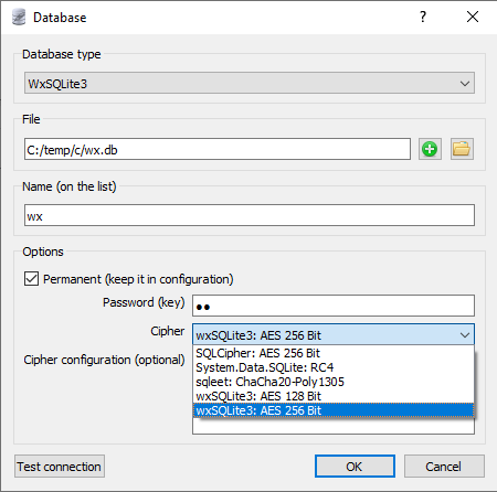 数据类型选择“System.Data.SQLite”,点击文件夹按钮,选择数据文件,并在Password一栏内输入已保存的密码然后点击“OK”按钮即可连接已有的数据库。