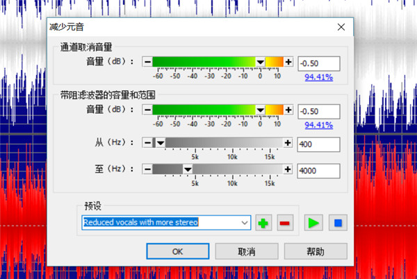 这里我根据需要选择了“Reduce vocals with more stereo”,也就是减少更多立体元音,选择之后,上面的所以参数都会自动调整至预设设定的值,然后我们点击”OK“按钮即可。