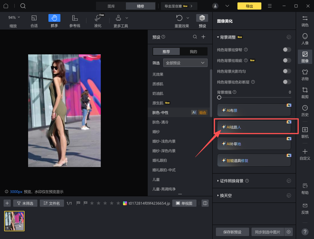 拥有透视矫正、胡型保护、眼白净化、眼睛对称等实用功能,证件照换衣服清晰度升级至4K,并支持保留原始背景,此外,智能消除可高效去除照片中的路人、瑕疵物体,修复区域自然逼真。