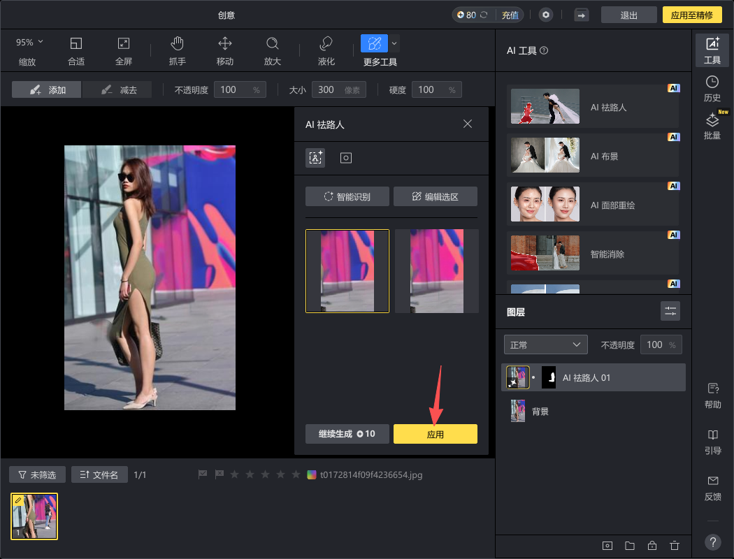 6、随后会自动涂抹路人区域,如果不满意,可以多次重复操作,重复涂抹,或者为追求精细,可以直接上手微修涂抹也是可行的,随后点击屏幕下方的“生成”。