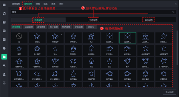 2)动画效果:为素材添加进场/强调/退场动画效果,使视频画面变得灵活生动