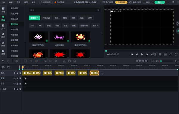 内置海量视频特效资源,包含特效文字、视频背景、动态蒙版等内容,点击下载即可添加。