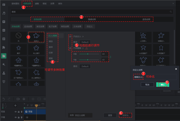 在时间轴上选中已添加的素材滑块,在元素工具栏中点击【动画效果】,选择进场/强调/退场效果,点击【自定义】,在弹出窗口中可以调节多种动画效果,在调节的同时可在软件右上方视频合成区域实时预览动画效果。调整完毕后,点击【另存为】为动画效果命名,然后点击确定,即可使用。这里以自定义【进场效果】为例进行说明。