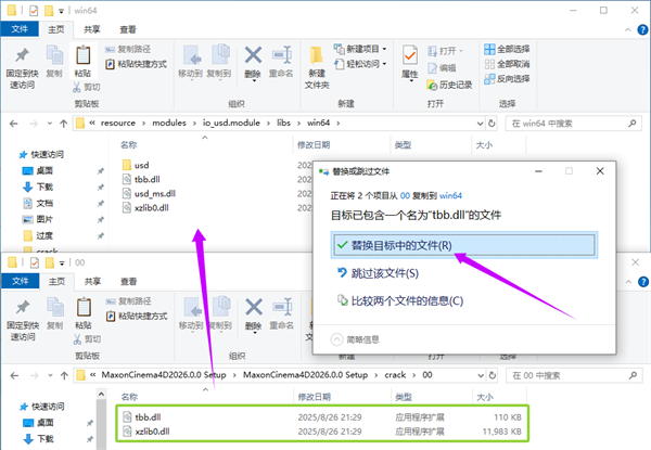 8、根据自己的情况选择补丁文件夹,如果您有RS订阅,请尝试使用文件夹'01'中的dll, 否则使用'00'文件夹中的dll,将文件夹里面的2个补丁全部复制到安装目录位置中进行替换。。