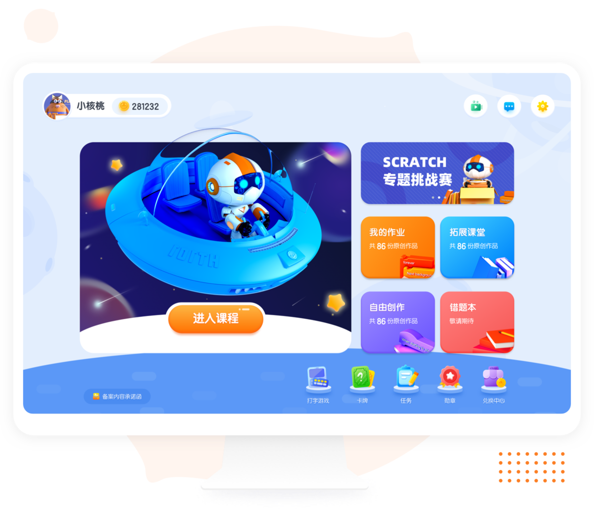 核桃编程电脑版采用风靡世界,专为孩子设计的图形化编程语言Scratch作为孩子入门编程的第一名语言,Scratch界面友好,生动有趣,每节课孩子都能完成一个创意小作品,能更有效地培养孩子的编程兴趣,提升孩子的编程能力