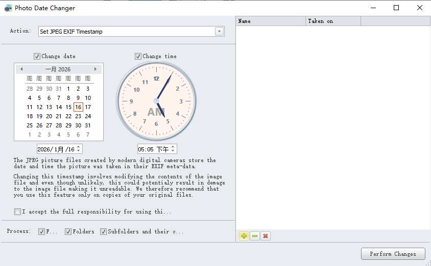 3、除了仅需您按“执行更改”按钮的最后一个操作外,其他操作还使您可以修改其某些属性。因此,“设置JPEG EXIF时间戳”可让您手动为图片配置精确的日期和时间。