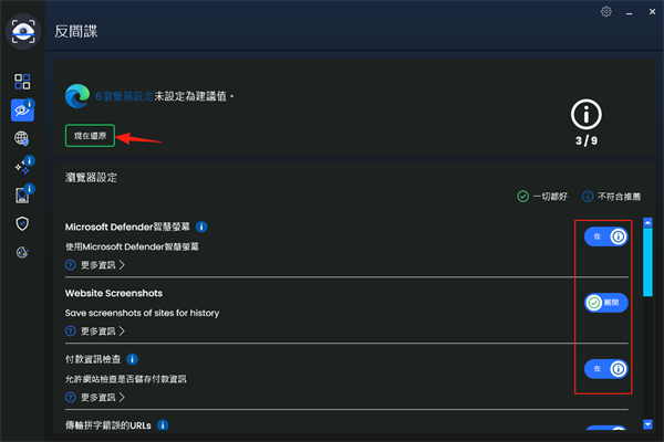 8、如果觉得需要一个个开关太过于麻烦,可以之间点击红框处,会开起所有保护,保护得分也会变成100,随后在根据需求是否关闭一些不需要的特定功能。