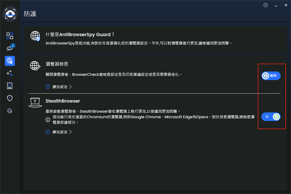 5、随后点击左边第三个板块,开启右侧开关,会提升防识别能力,可以提升防止广告和网站对个人信息的收集能力的提升。