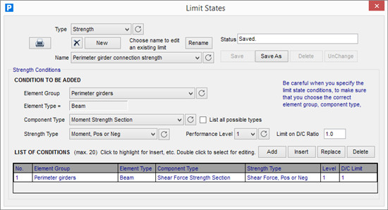 2、变形D/C比可用于检查非弹性部件是否具有足够的延展性,而强度D/C比可用于检查弹性部件是否具有足够的强度以保持弹性。可以使用以下响应措施定义极限状态: