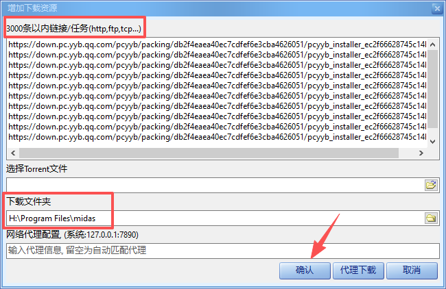 2、输入文件下载链接(最多支持3000条),设置下载文件的路径,点击确定即可批量下载。