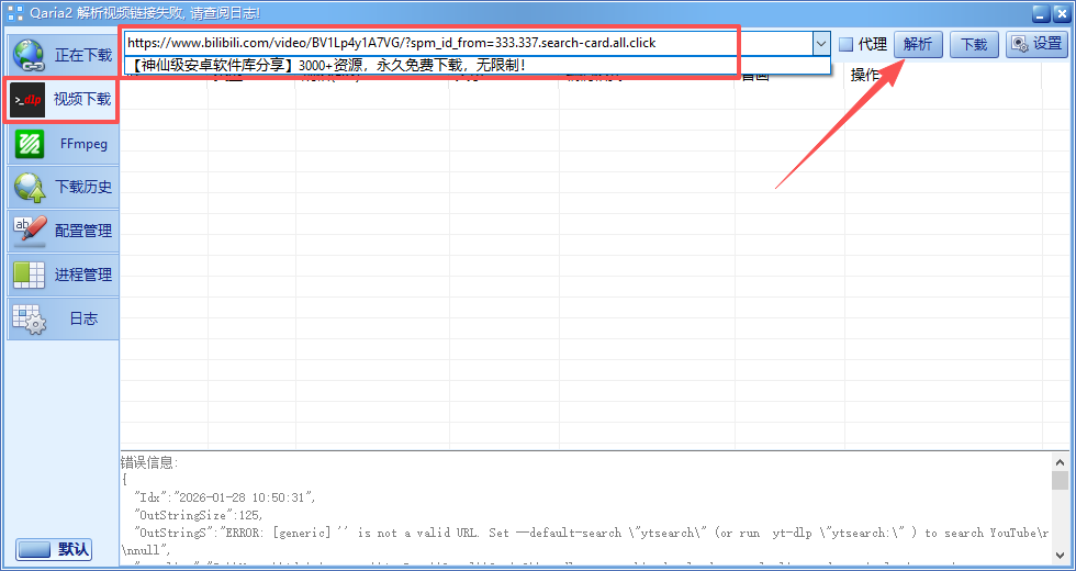 1、点击视频下载,并将哔哩哔哩的完整视频链接复制指定位置进行解析。