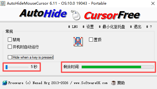 拖动左下侧拖条即可选择多长时间后软件自动将鼠标隐藏起来,而右下侧的 Timer则是鼠标不活动的时长计时,比如拉选时间为5s,那么接下来静待(不动鼠标)5秒后,鼠标就会自动隐藏起来。