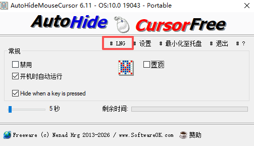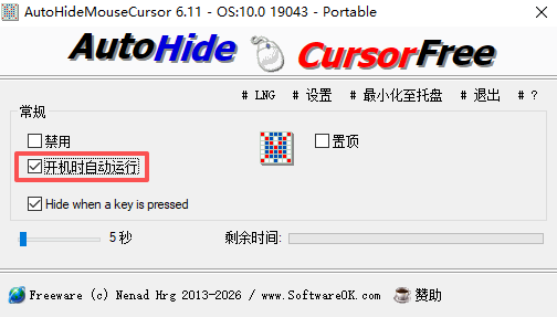 AutoHideMouseCursor还提供高度自定义选项,如隐藏时间设置和随系统启动等功能,以方便用户进行个性化使用,同时它支持多语言界面,可满足更多用户的需求,有需要的用户欢迎下载使用。