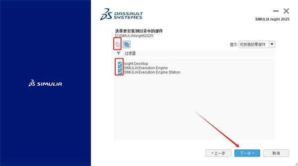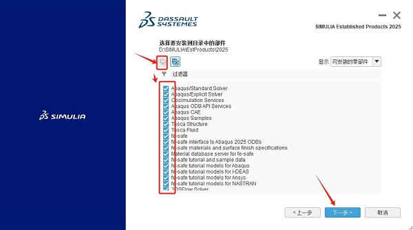 19、选择要安装到目录中的组件,点击全部勾选的图标,然后所有部件就全部勾选上了,再点击【下一步】。