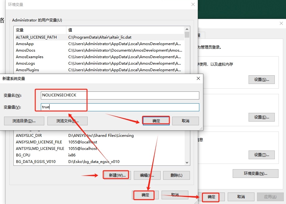 10、点击【新建】,弹出对话框,变量名输入【NOLICENSECHECK】,变量值输入【true】,然后点击确定-确定-确定。