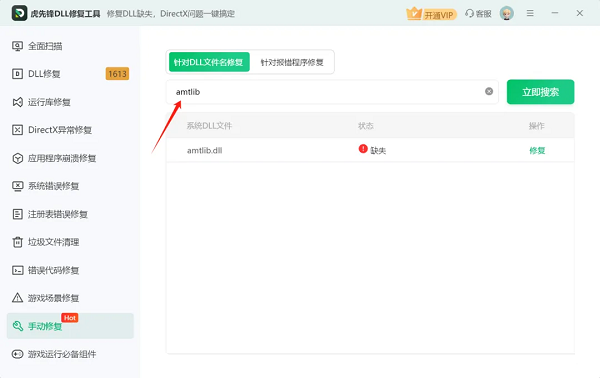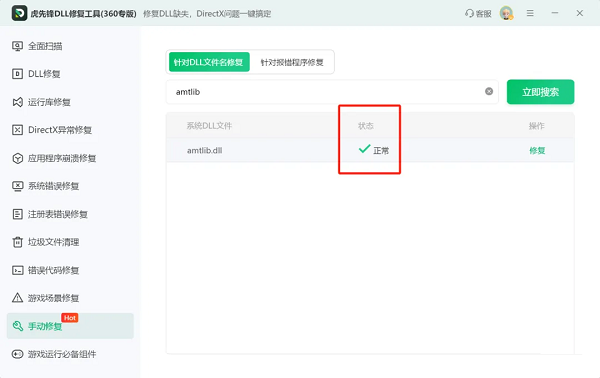 在虎先锋DLL修复软件中,具备【手动修复】功能,找到想要的DLL文件,点击【修复】,即可【修复成功】,这里状态由【缺失】将由变成【正常】。