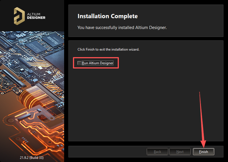 9、取消勾选【Run Altium Designer】,点击【Finish】。