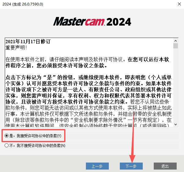 7、选择【是,我接受许可协议中的条款】,点击【下一步】。