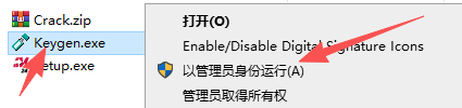 10、解压【Crack】压缩包得到【Keygen.exe】文件,鼠标右击【Keygen.exe】选择【以管理员身份运行】。