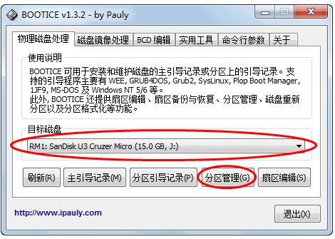 插入U盘->双击“2_引导设置.exe”即可进入BOOTICE主界面,【目标磁盘】下会自动检测到本地硬盘和U盘,一般情况会自动定位到首个U盘,如果没有自动定位到你的U盘,请手动选择U盘即可。主界面下方有5个按钮,选择第4个按钮【分区管理】。