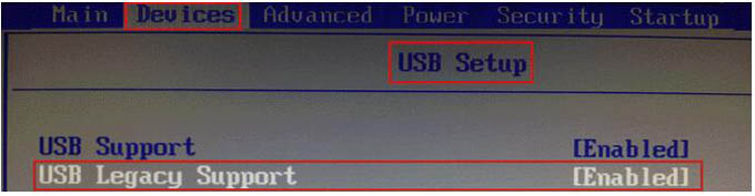 补充:2012年以后生产的电脑多数不再使用BIOS作为固件,而是采用UEFI作为固件(但也提供兼容选项,见硬盘版相关说明),当使用此方法时,开机列表中很有可能没有USB选项,怎么办?解决办法是:开机按“Del”键(有的电脑是按“F1”或“F2”,有的电脑按“Fn+F2”....)进入UEFI。首先,选择 Devices -> USB setup -> USB Legacy Support 设置为 Enabled,如下图。