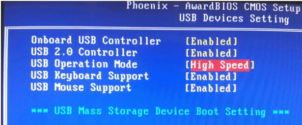 (2)在上述情况下,如果U盘运行缓慢,有可能是BIOS设置错误,请将USB Operation Mode这项设置成HighSpeed(高速模式),如图: