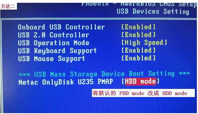 ①首先,选择“Integrated Peripherals”回车,再选择“USB Devices Setting”回车,将“USB Mass Storage Device Boot Setting”中的U盘一项,由原来的“FDD mode”(软盘模式)设置成“HDD mode”(硬盘模式)