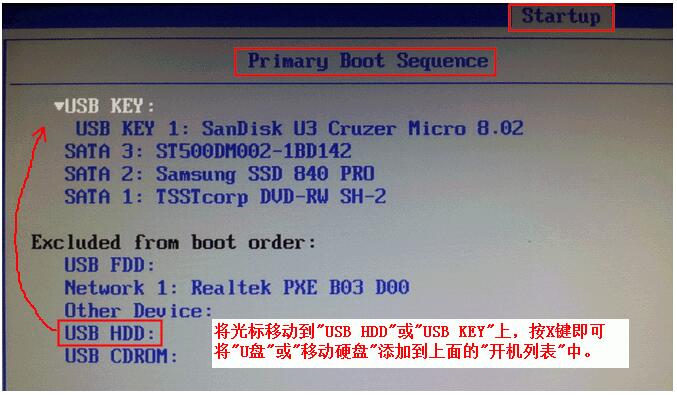 然后,将下方的“备选列表”中的USB选项添加到上方的“开机列表”中,如下图。