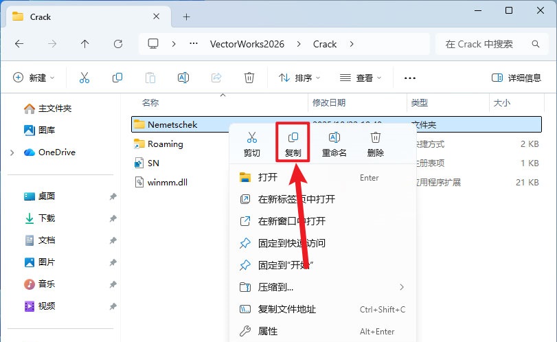 9、继续在打开的【Crack】文件夹中,鼠标右击【Nemetschek】文件夹选择【复制】。