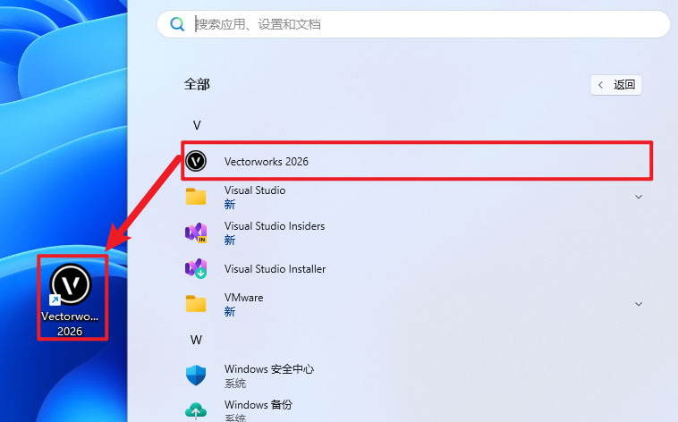 13、创建桌面快捷方式:①点击桌面任务栏中的【开始图标】>点击【所有应用】②将【VectorWorks 2026】图标拖到电脑桌面。