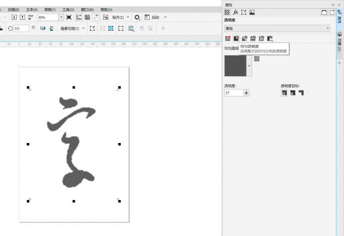2、调整透明度。选中参考字,在属性窗口中找到【均匀透明度】,适当降低透明度。这样做的好处是能让字帖看起来更浅,方便在上方进行描摹而不会混淆。