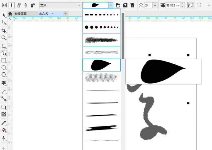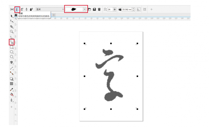 3、选择艺术笔刷。在左侧工具栏中点击【艺术笔】,在上方的笔刷选项中挑选合适的笔刷,CDR自带多种笔触效果,这里推荐使用带有墨点质感的笔刷,能更好地模拟书法笔墨的浓淡变化。