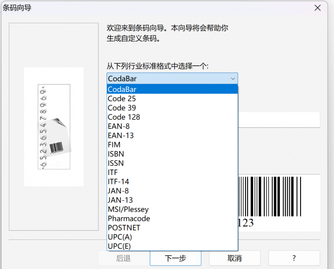 2、选择条码格式。在条码向导中,可以看到软件内置的多种条码类型,适用于不同行业和场景。比如Codabar(库德巴条码),它是一种广泛应用在物流、图书馆和血库系统的条码格式,支持数字0-9以及部分符号,一般长度在4到16位之间。我们可以根据项目需要选择合适的类型,然后在下方输入相应的数据内容,点击【下一步】。