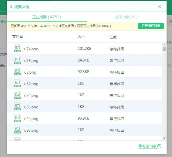 5、打开【找回详情】后,您可以点击【打开所在目录】就可以查看找回的文件保存目录了。