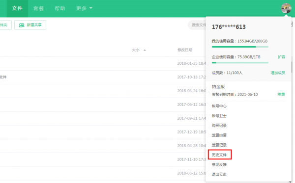 1、打开下载好的好360云盘软件,打开软件后点击右上角的头像,在弹出的选项中点击“历史文件”选项。