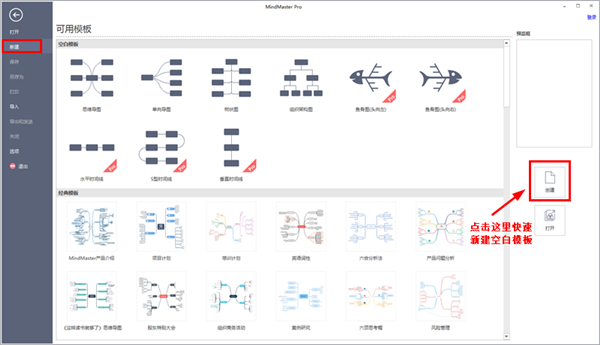 1、下载本站软件,接下来,打开MindMaster思维导图软件,进入到软件首页,点击“新建”,然后你会看到有很多精美的模板,你可以直接点击这些模板开启绘图之旅,也可以点击右侧“创建”一个空白模板进入画布。小编在这里以空白模板为例,创建一个向两侧发散的思维导图。