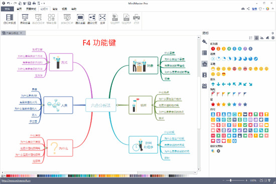 在用思维导图做演示讲解的时候,常需要屏蔽其他主题的内容,这个时候,使用F4功能键的该功能,即可“上钻”思维导图(折叠其他主题)。