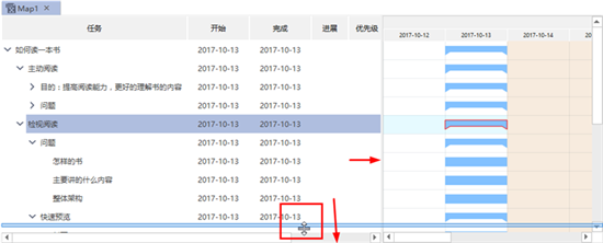 移动鼠标至下图中所示位置,当鼠标变成双向的箭头时,按住鼠标左键不松手,再移动鼠标,可以调整甘特图的长宽。