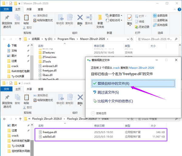 9、将Crack文件夹中的补丁复制粘贴至ZBrush 2026的安装目录中进行替换。