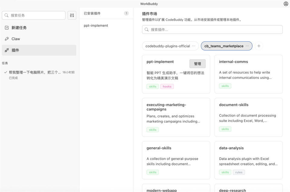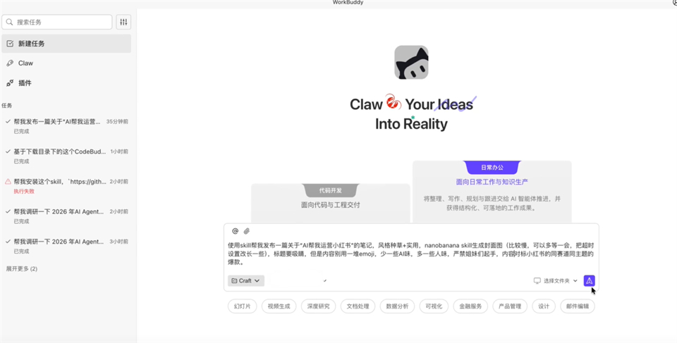 WorkBuddy属于典型地不能再典型的AI Agent页面,主区域分成代码开发和日常办公两块,左侧则放了新建任务、Claw、和插件三个入口,be like: