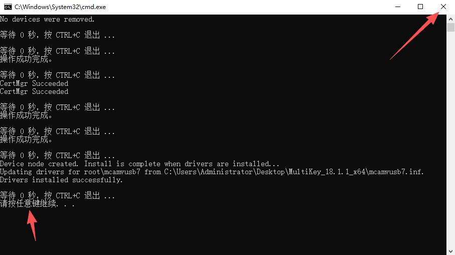 20、看到【请按任意键继续】后,点击【X】关闭窗口。
