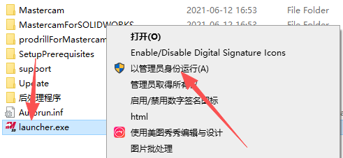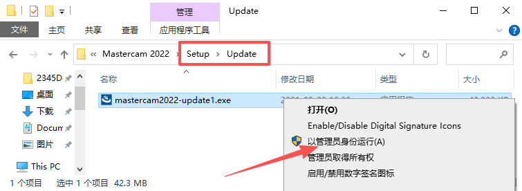 11、依次打开【Setup-Update】文件夹,鼠标右键【mastercam2022-update1】选择【以管理员身份运行】。